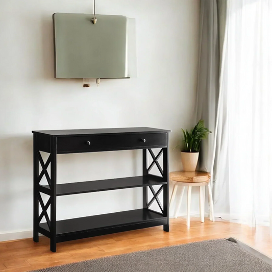 Black Console Table with Drawer and Open Shelves – Elegant Accent