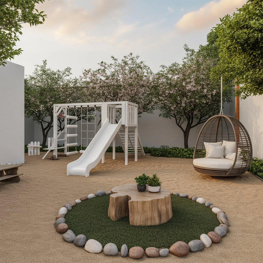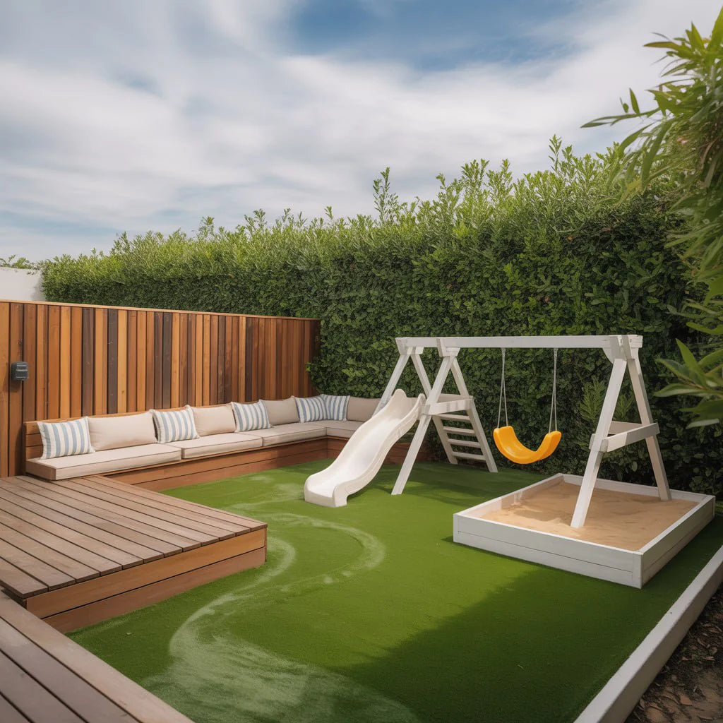 Transform your backyard into a safe and stylish play zone with this modern wooden outdoor...