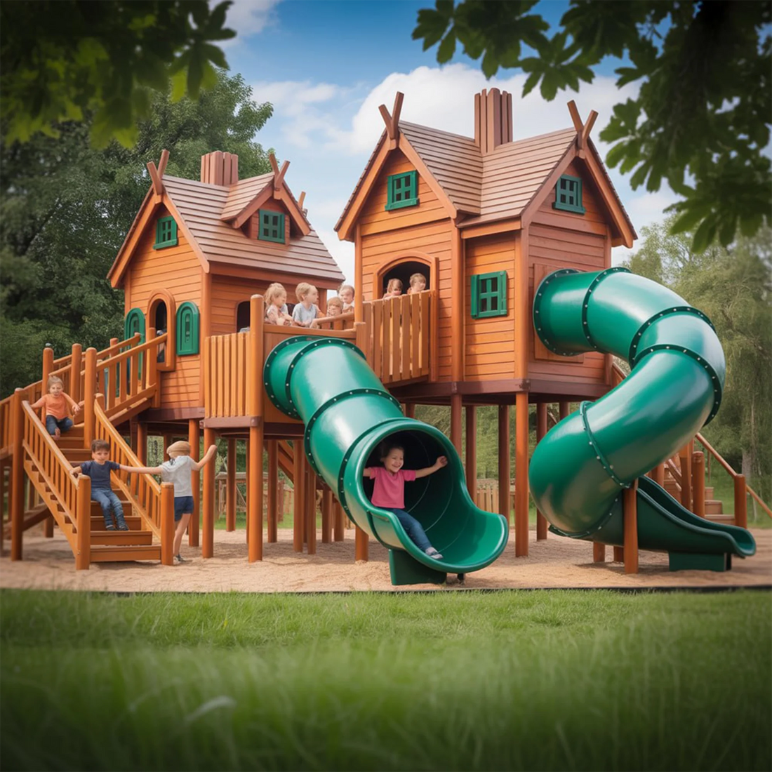 Modern Elevated Playhouse with Spiral Slide – Outdoor Wooden Adventure Set, 22ft x 12ft x 9ft