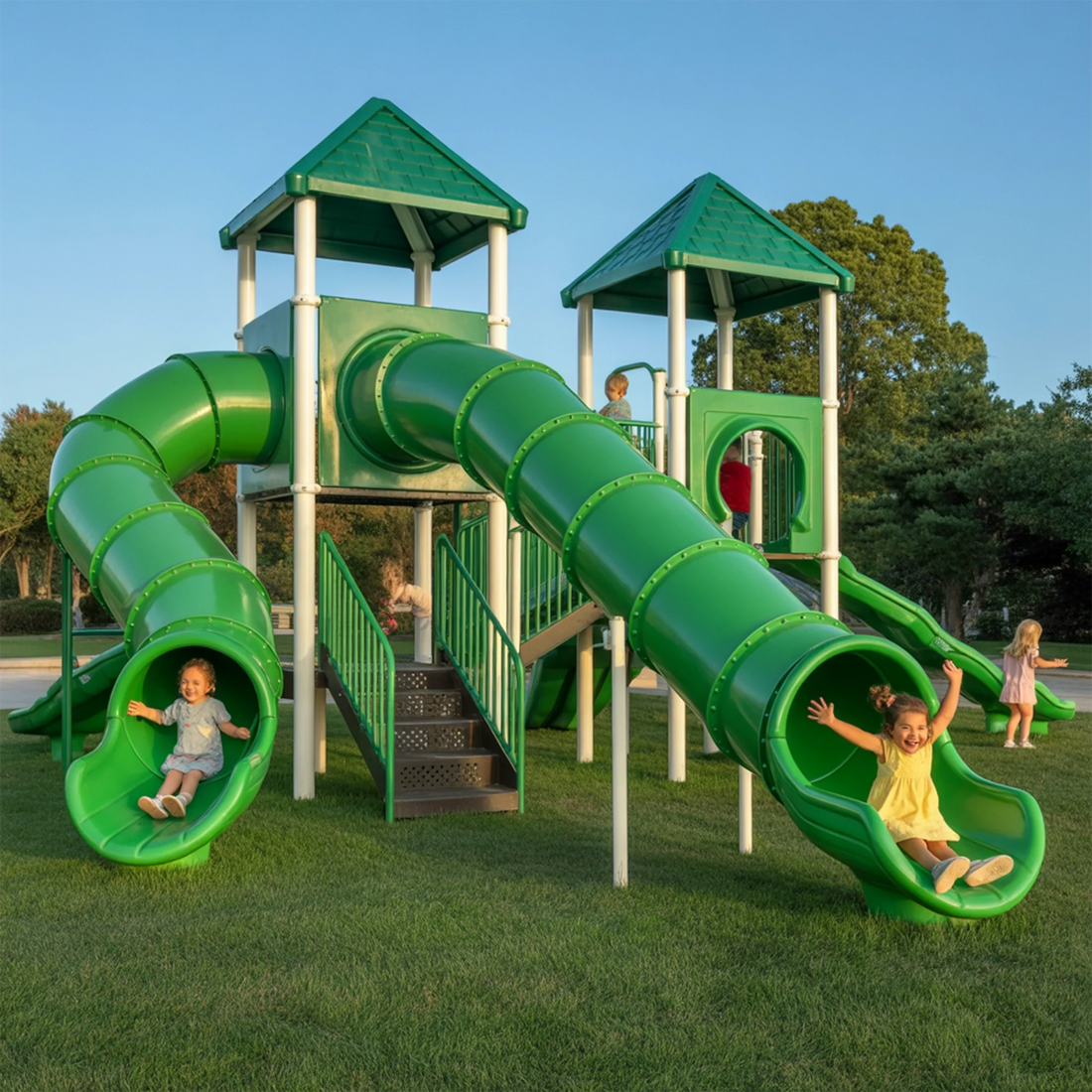 Twin Tower Wooden Playground with Dual Spiral Tube Slides | Outdoor Playhouse for Kids Backyard Adventure