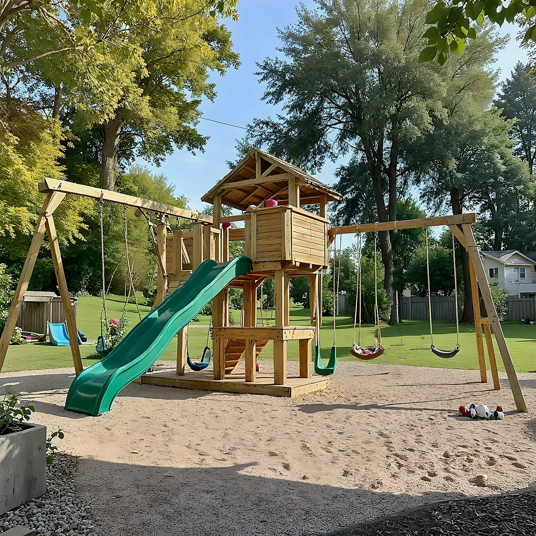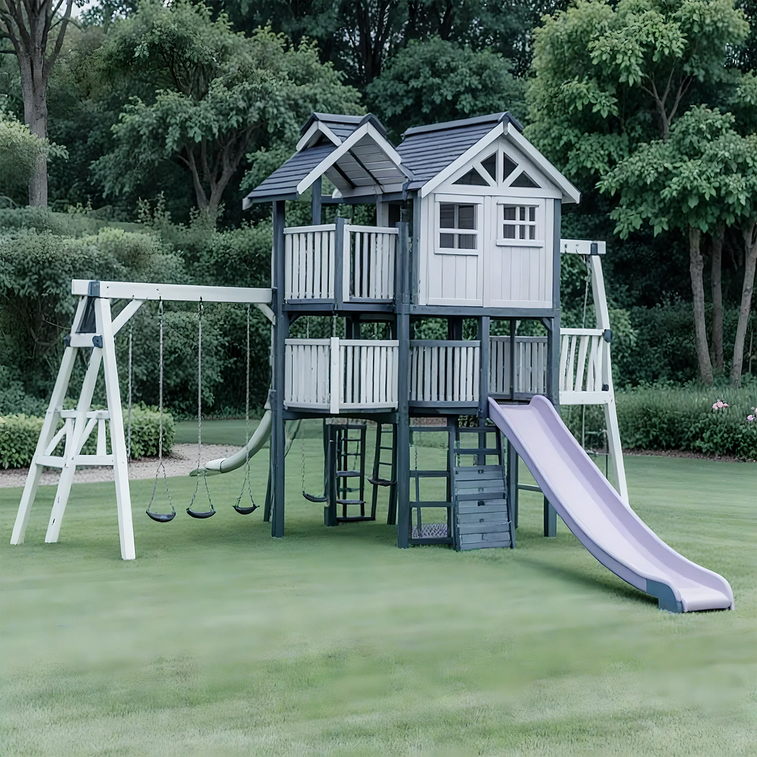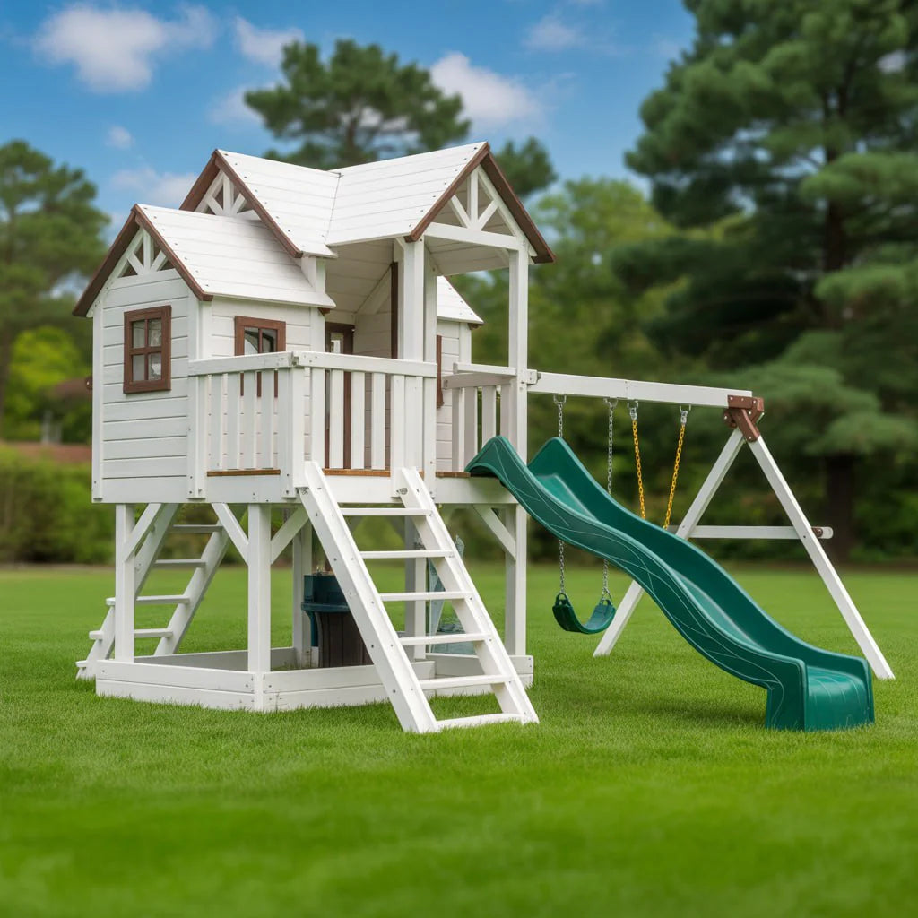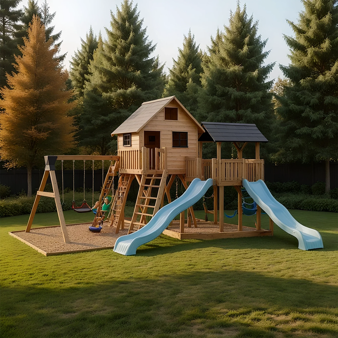 Safe Outdoor Playset for Kids – Wooden Playhouse, Climbing Ladder, Swings & Slides
