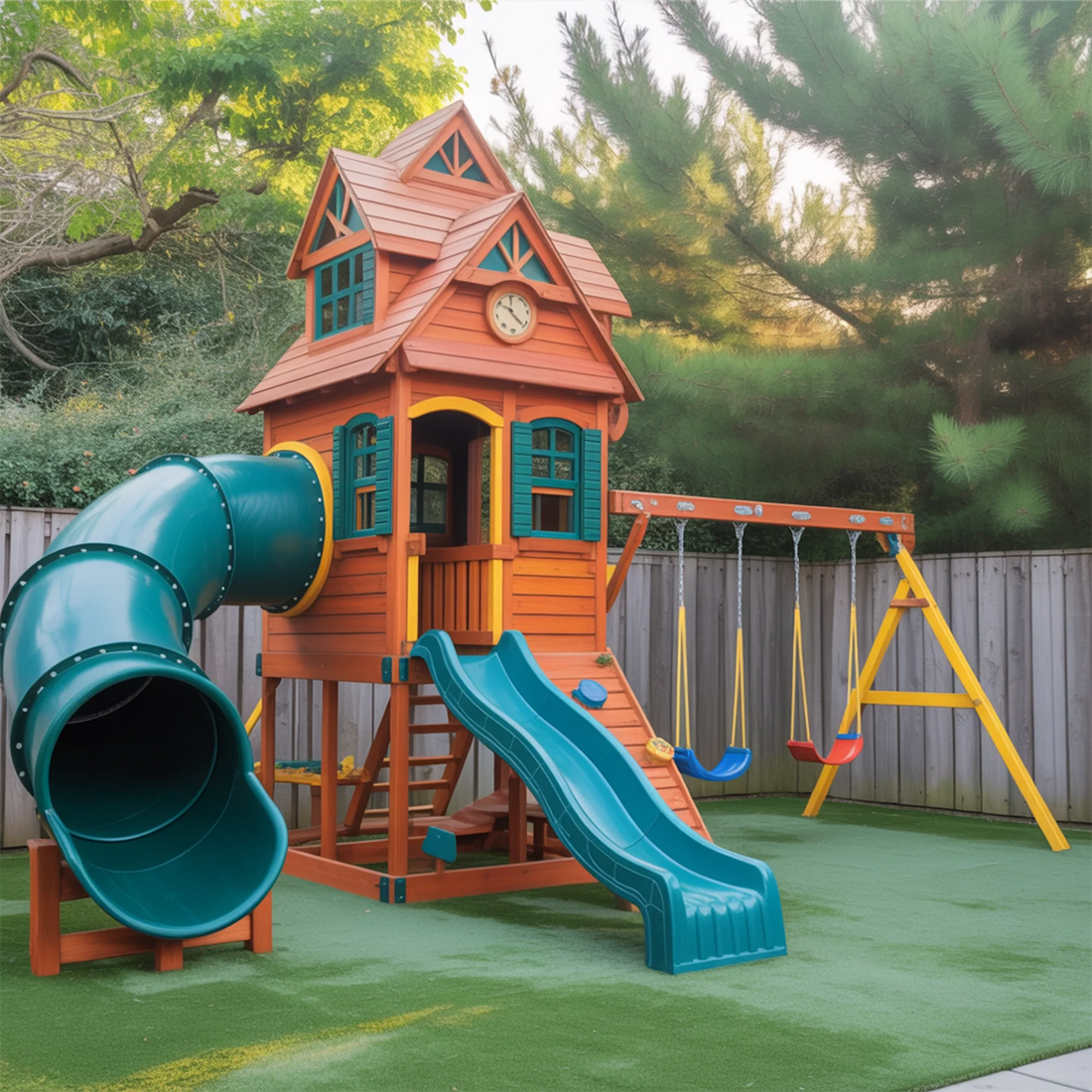 Transform your backyard into an adventure playground with our Wooden Swingset with Tube Slide –...