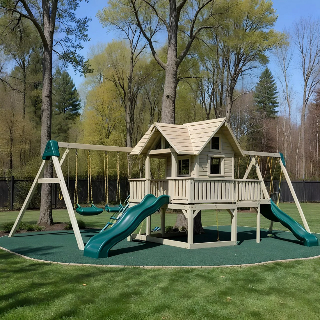 Solid Wood Outdoor Playhouse with Double Swings & Slide – Durable Backyard Playground Set 22ft x 10ft x 9ft