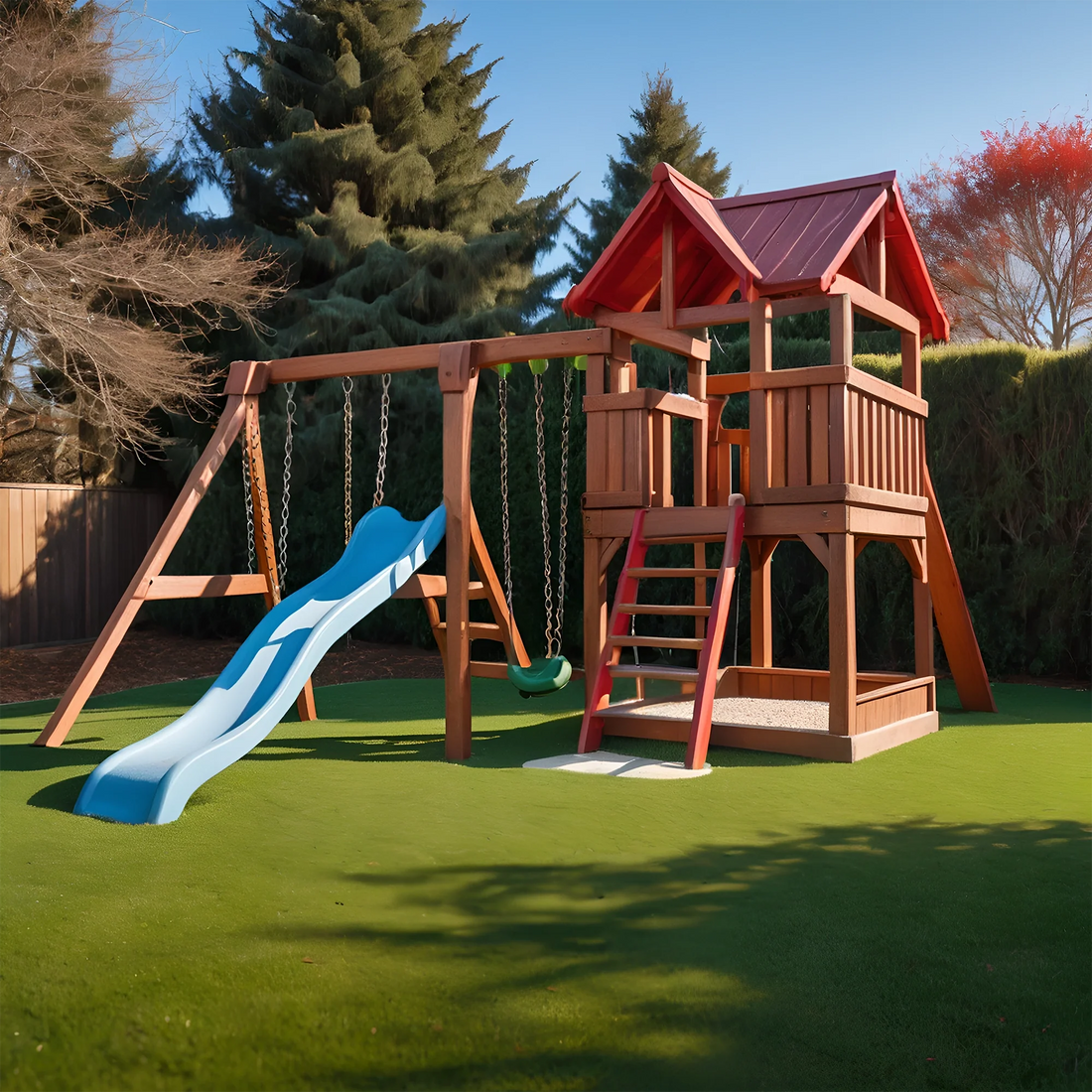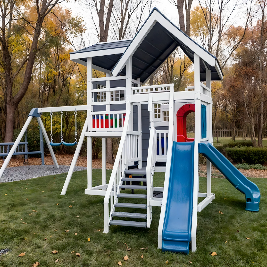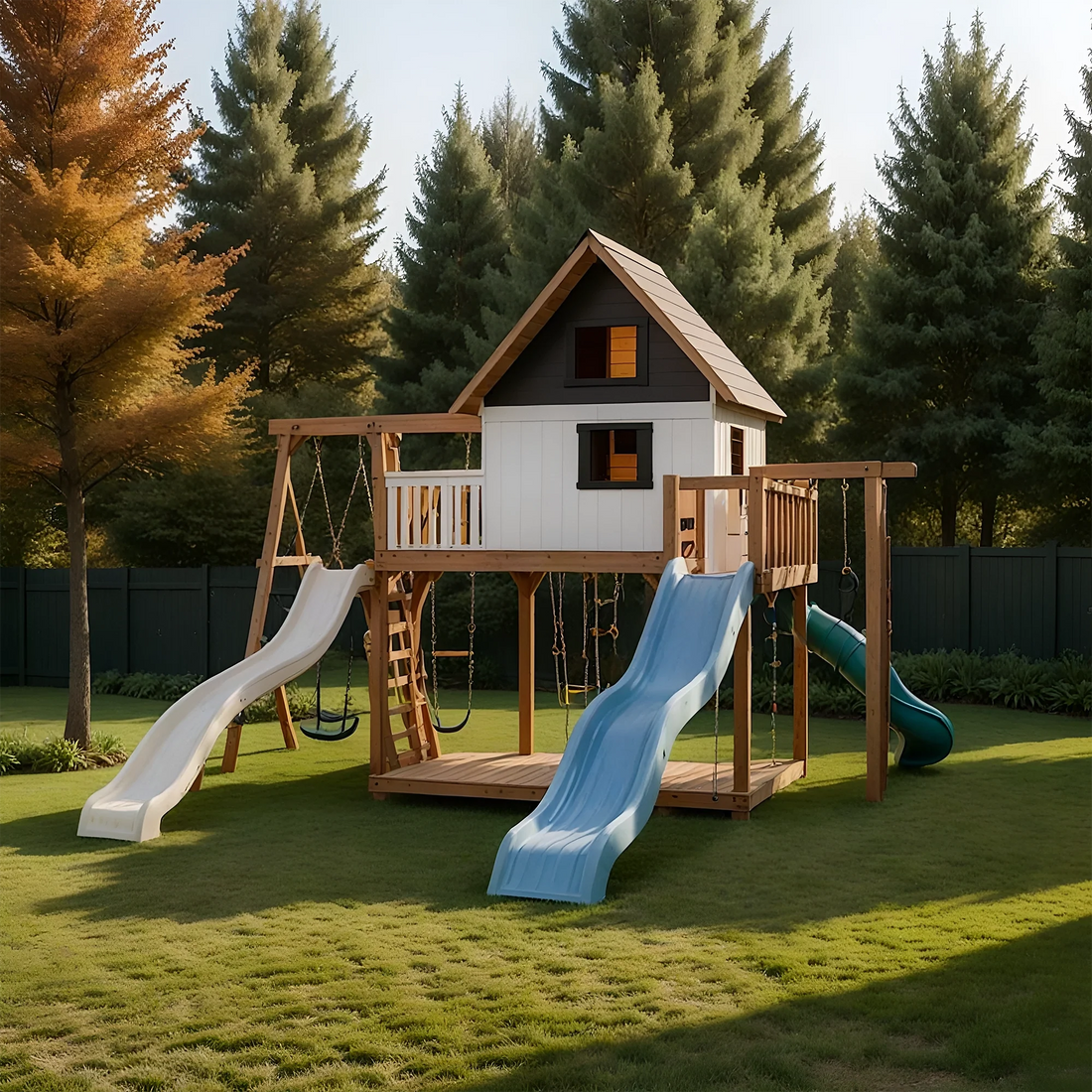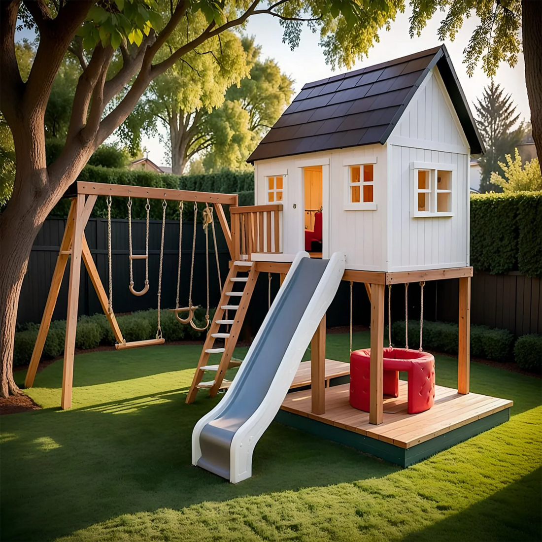 Backyard Playground Swing Set – Wooden Playhouse with Slide and Safe Kids Swings