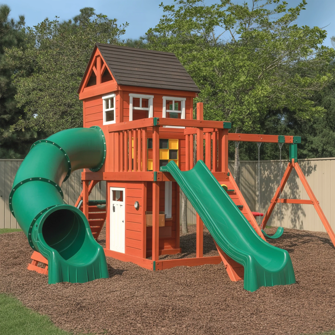 Bring adventure to your backyard with this wooden kids playhouse featuring dual slides, tube slide,...