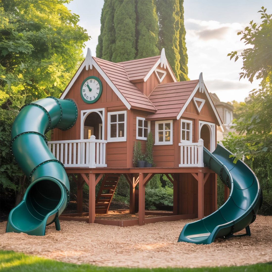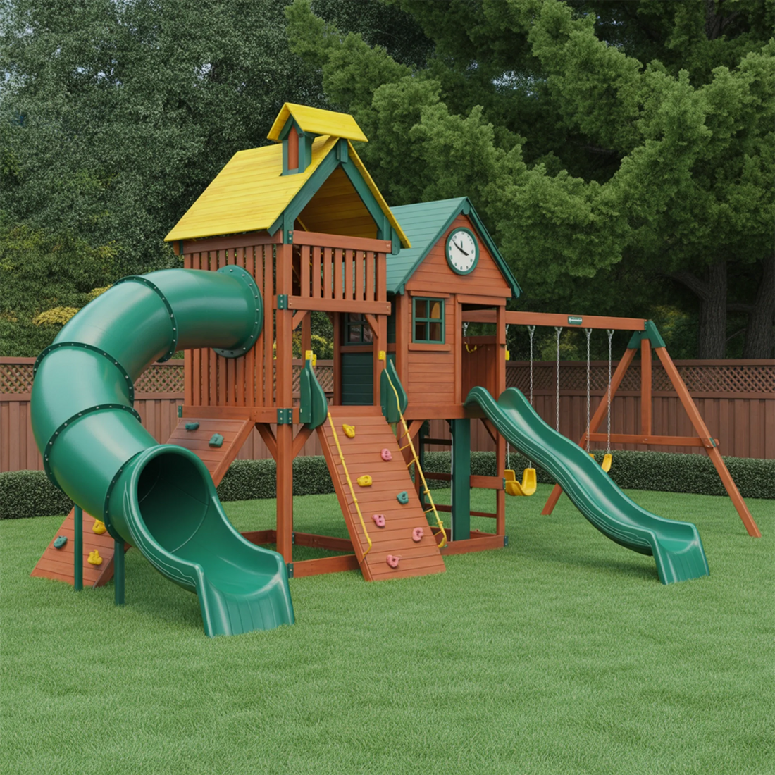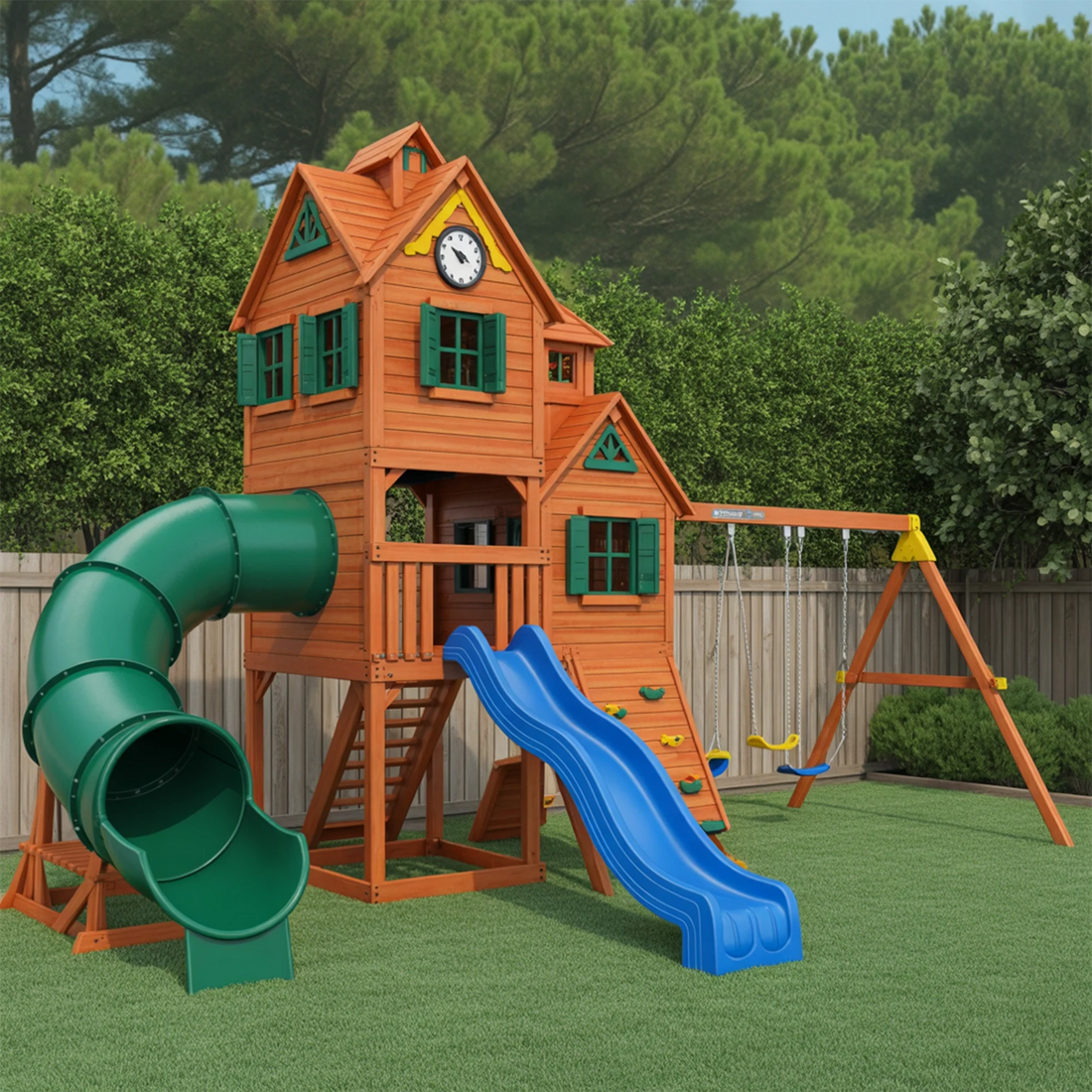 Deluxe Wooden Swingset with Double Wave Slides & Clubhouse Tower