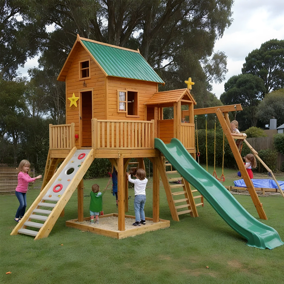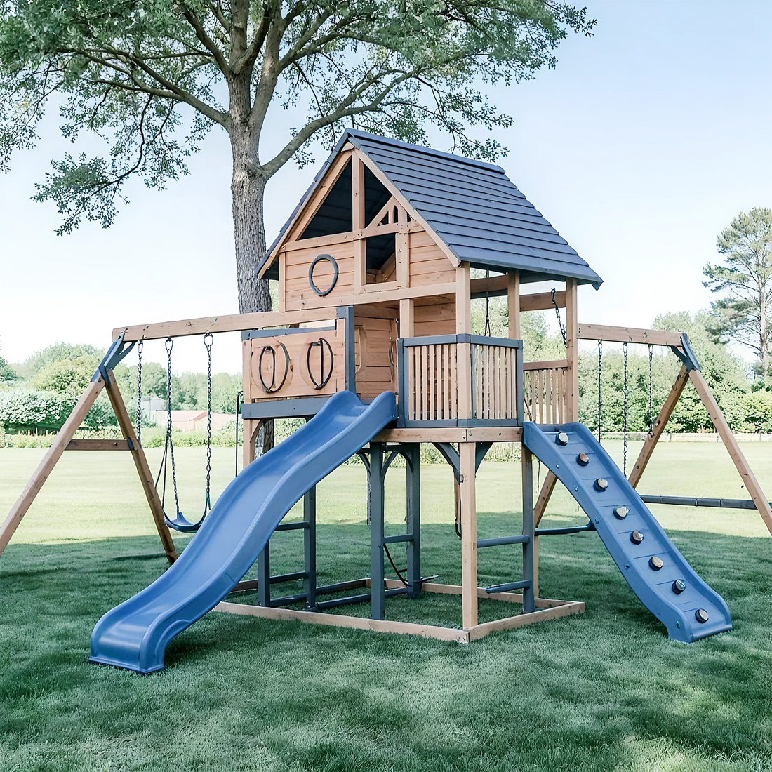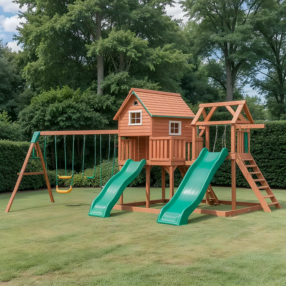 Deluxe Wooden Swing Set with Playhouse, Slides & Climbing Features