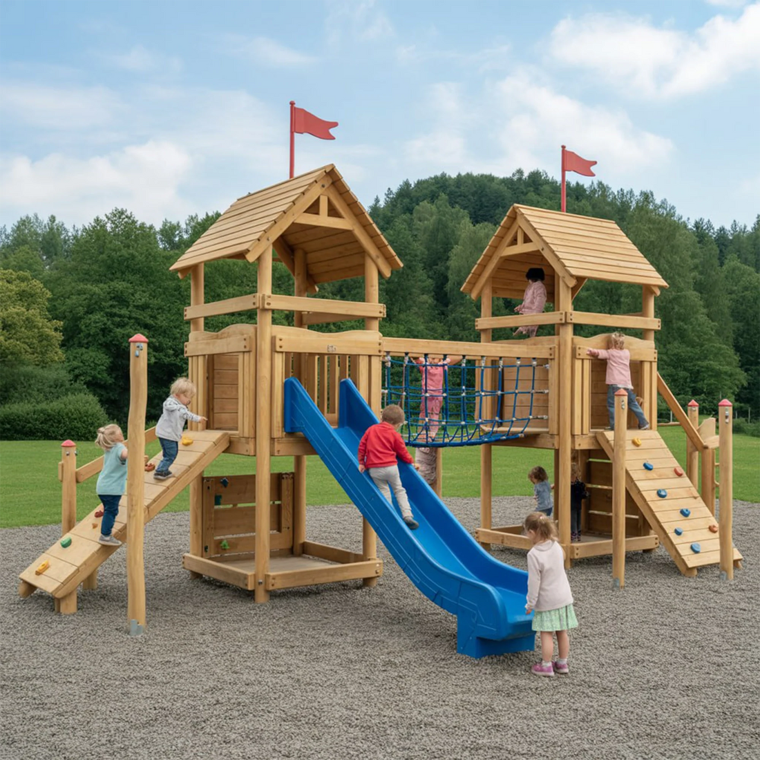 Heavy-Duty Wooden Swingset with Spiral Slide & Double Towers