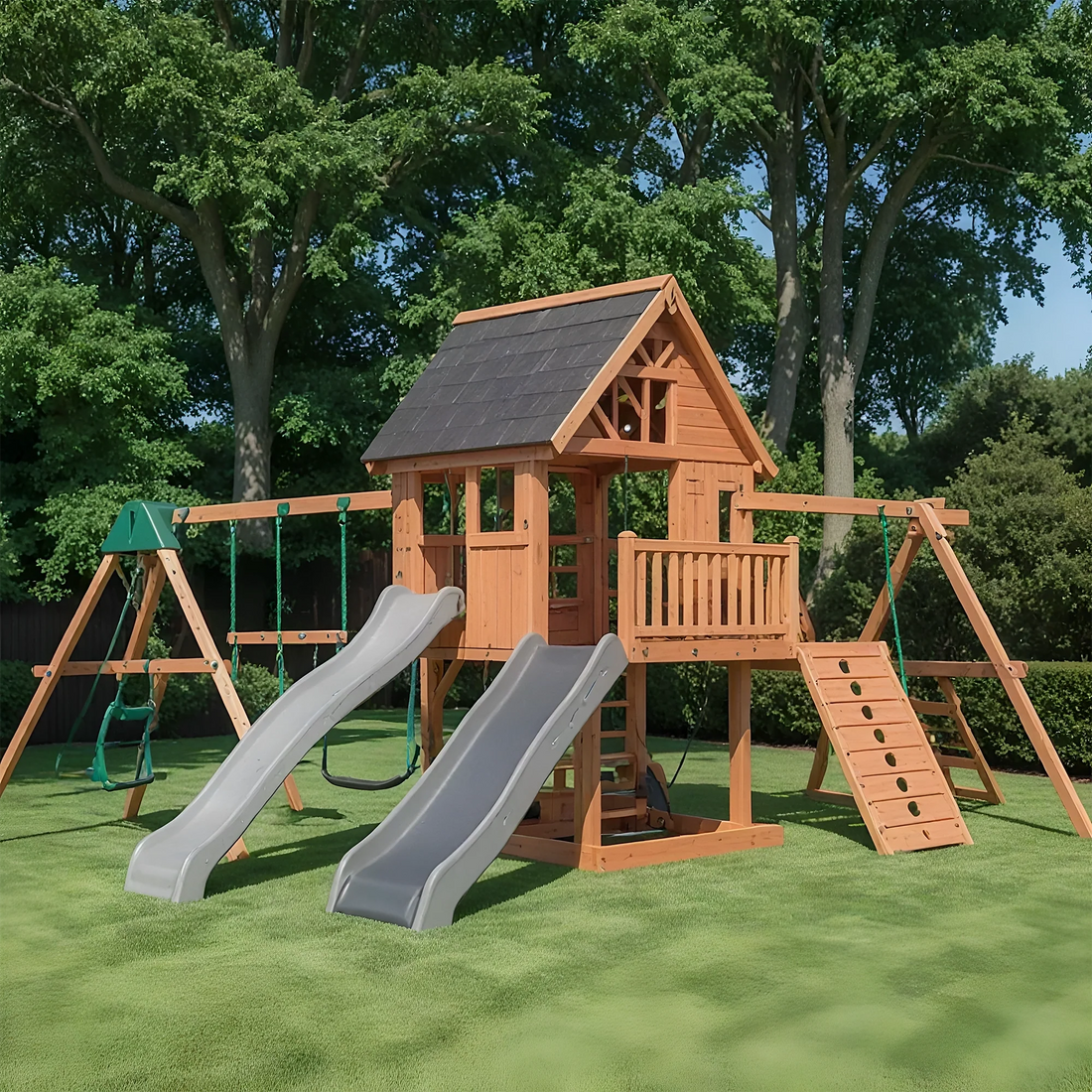 Heavy-Duty Wooden Swing Set – Outdoor Play Structure with Slides & Climbing Features