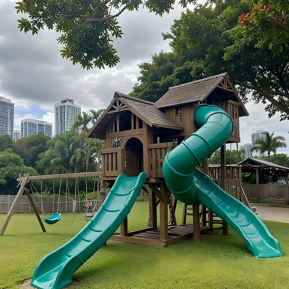 Heavy-Duty Wooden Swingset with Spiral Tube Slide & Double Swings