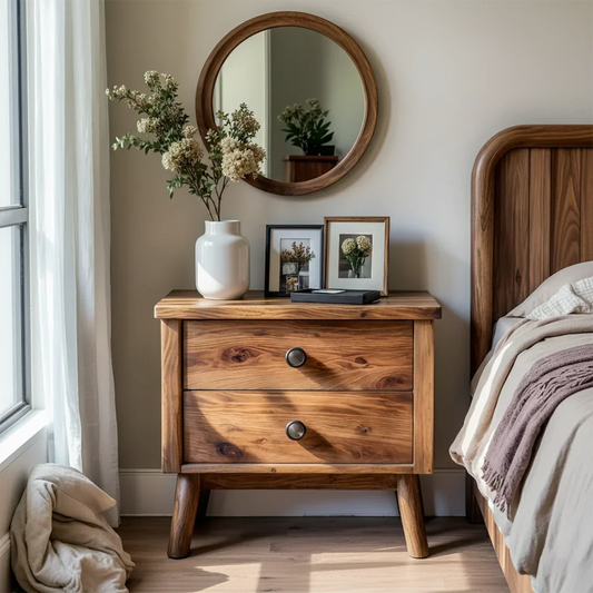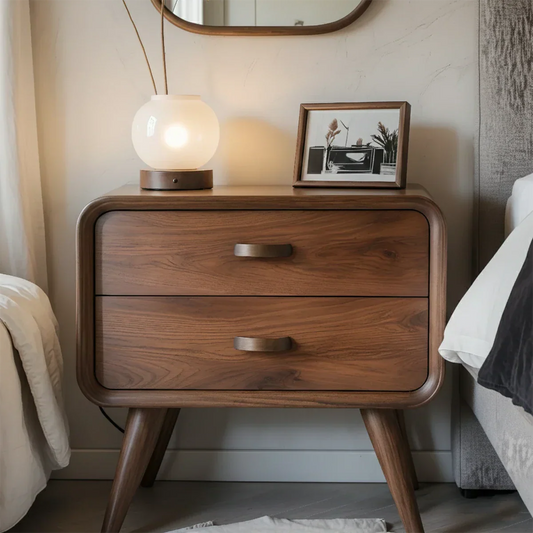 Solid Wood Mid-Century Nightstand with Two Drawers