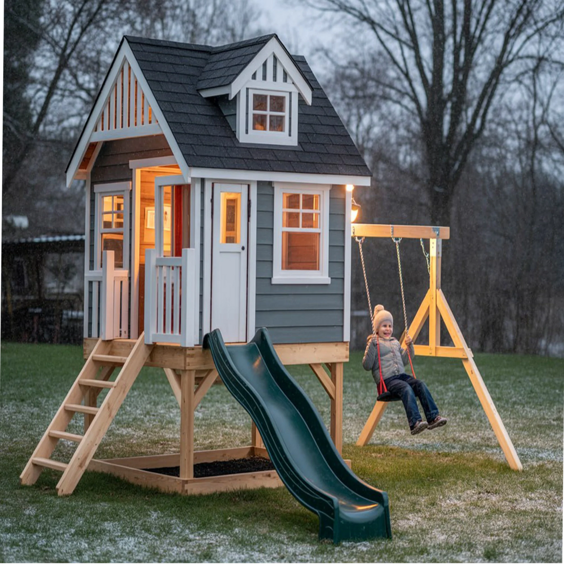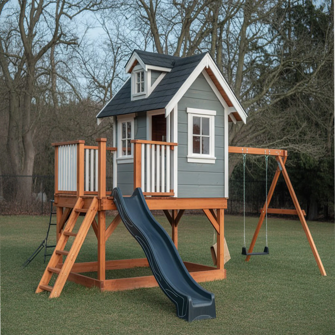 Luxury Wooden Playhouse with Slide & Swing Set – Outdoor Kids Play Structure 22x22 ft, 9 ft Height