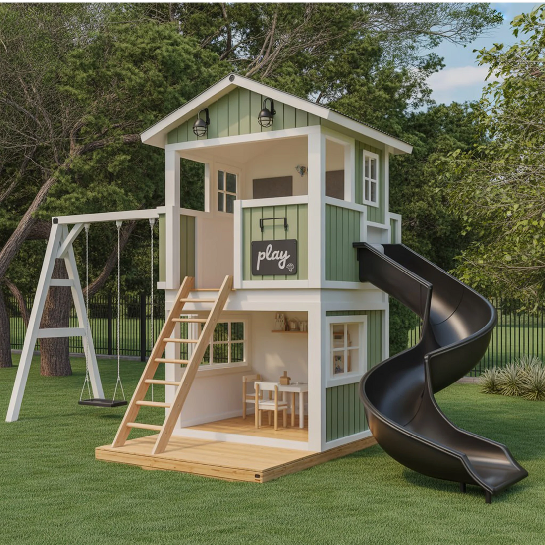 Modern Kids Playhouse with Slide and Swings – Outdoor Backyard Fun