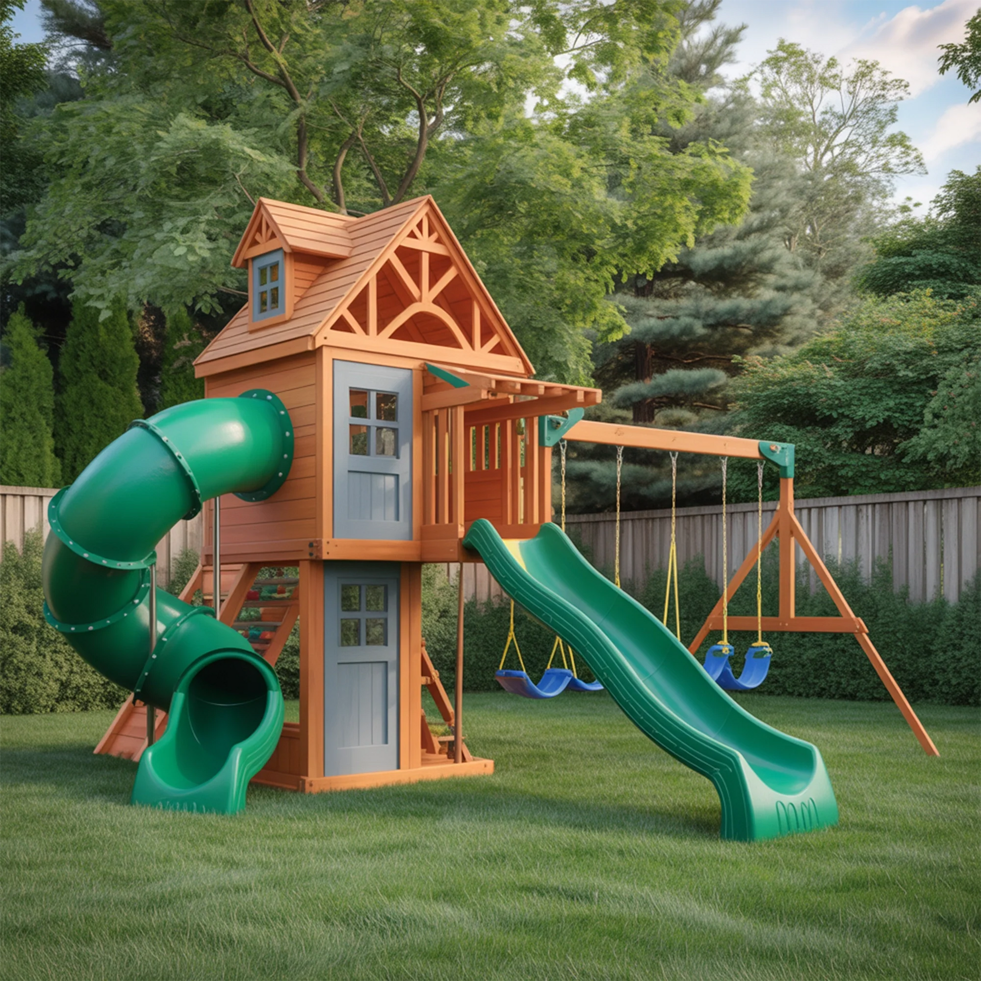 This playset is a complete backyard adventure center, offering multiple activities in one safe and stylish structure. From climbing and sliding to swinging and imaginative play, it keeps kids engaged, active, and entertained.