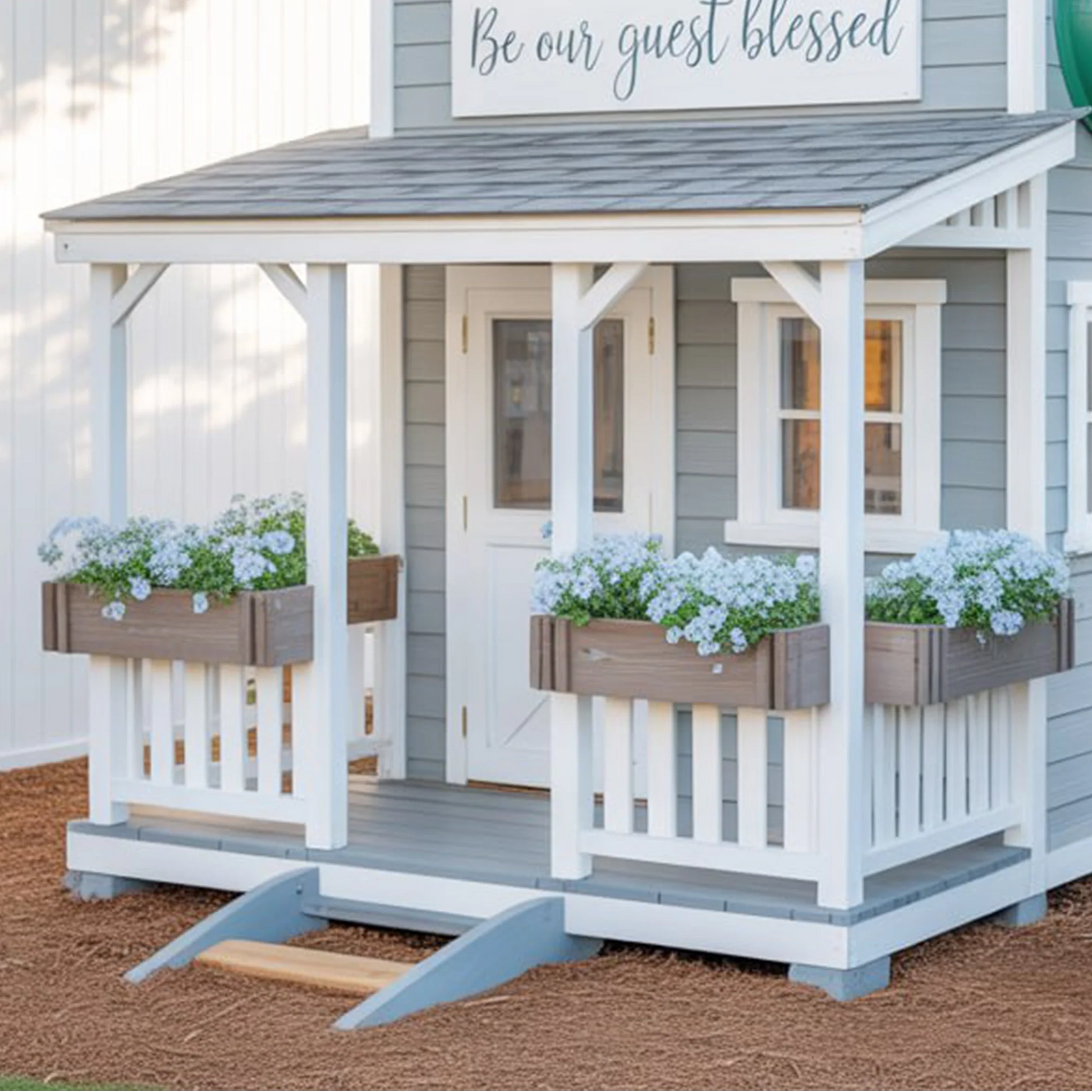 Bring endless fun and imagination to your backyard with this luxury wooden playhouse featuring a spacious design and multi-functional play options. Crafted from durable, weather-resistant wood, the playhouse is elevated for extra safety and includes a charming front porch, flower boxes, and detailed windows.