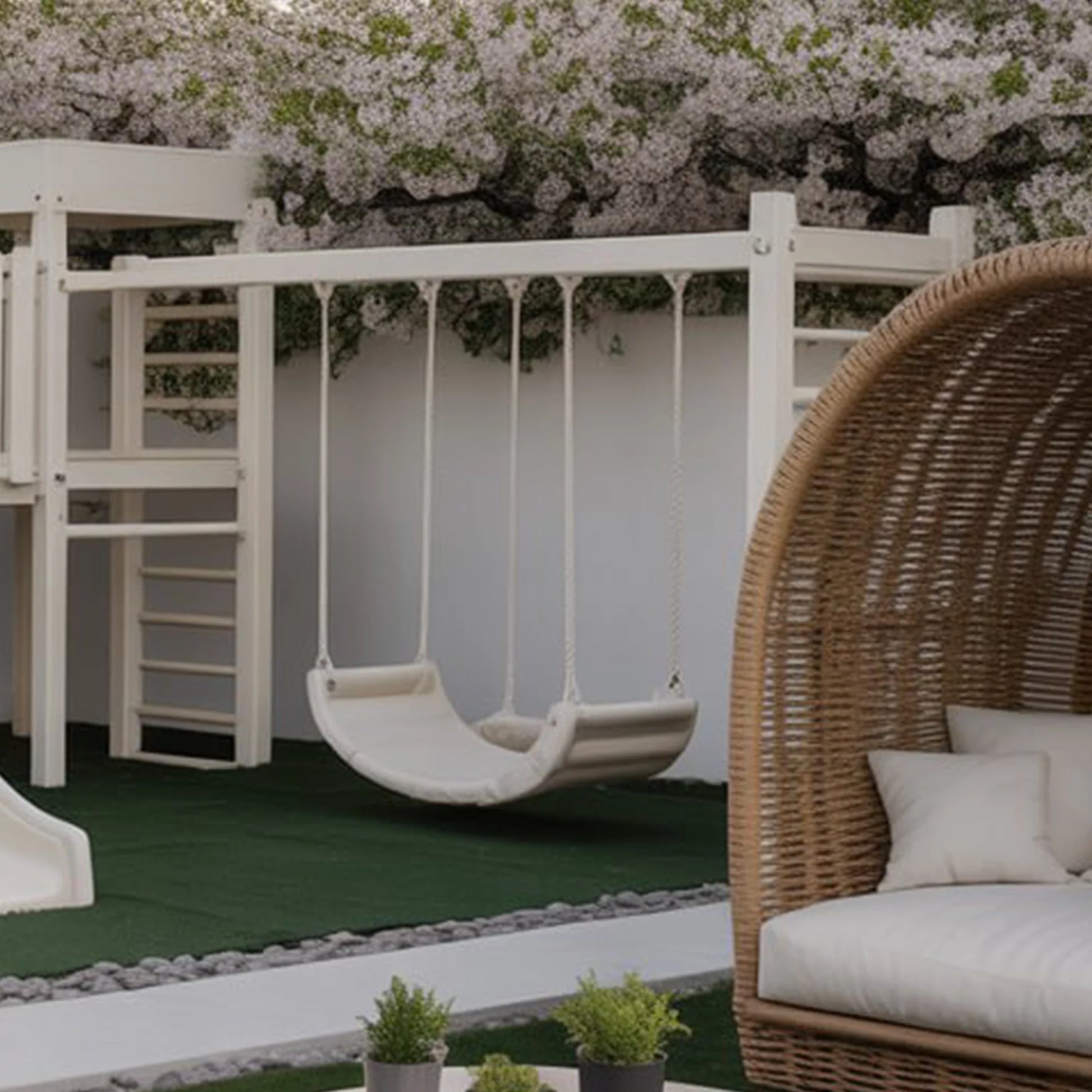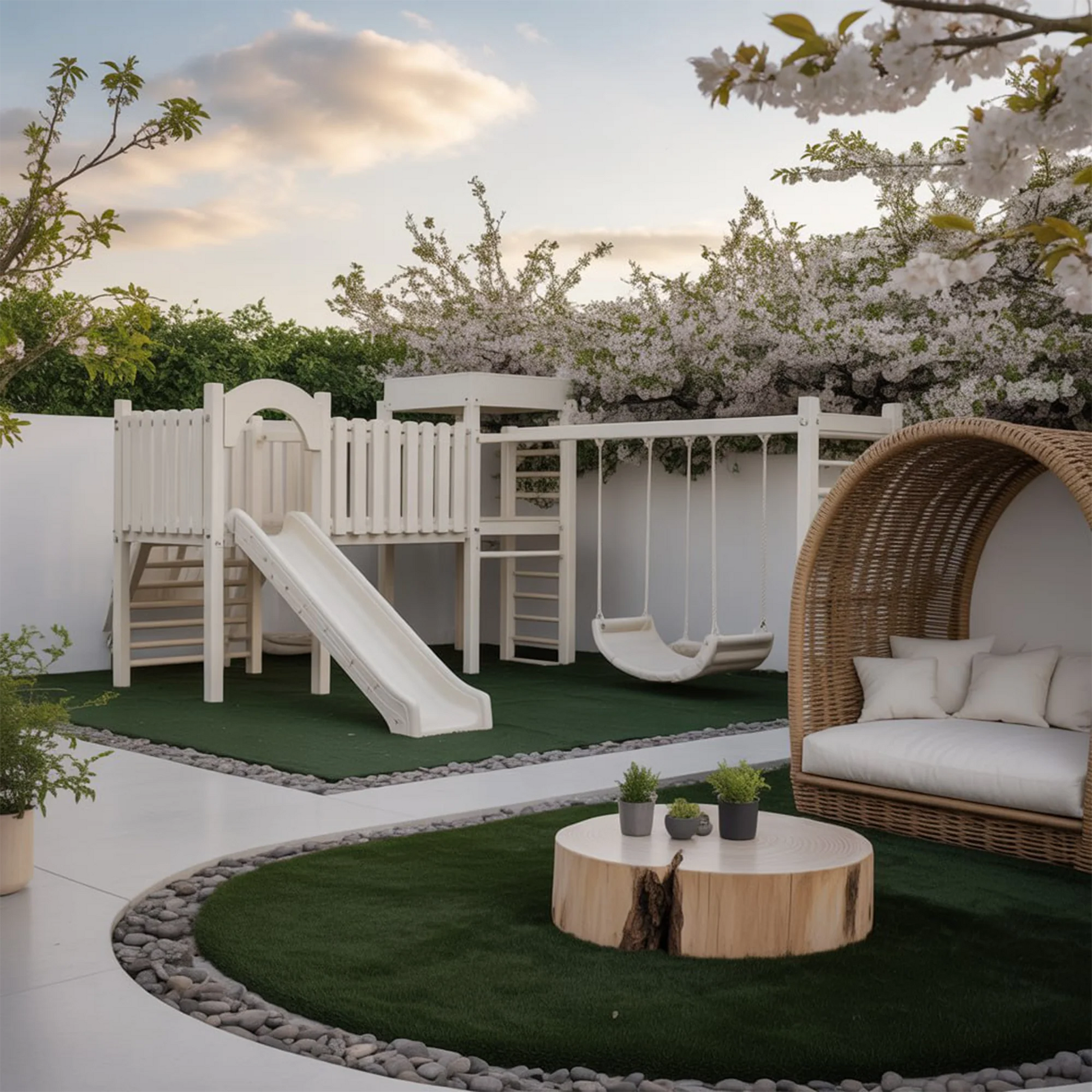 Transform your backyard into a world of fun and imagination with this modern wooden playhouse and swing set. Designed with clean lines and a natural white finish, this playground structure blends seamlessly into any outdoor space while offering endless play opportunities.