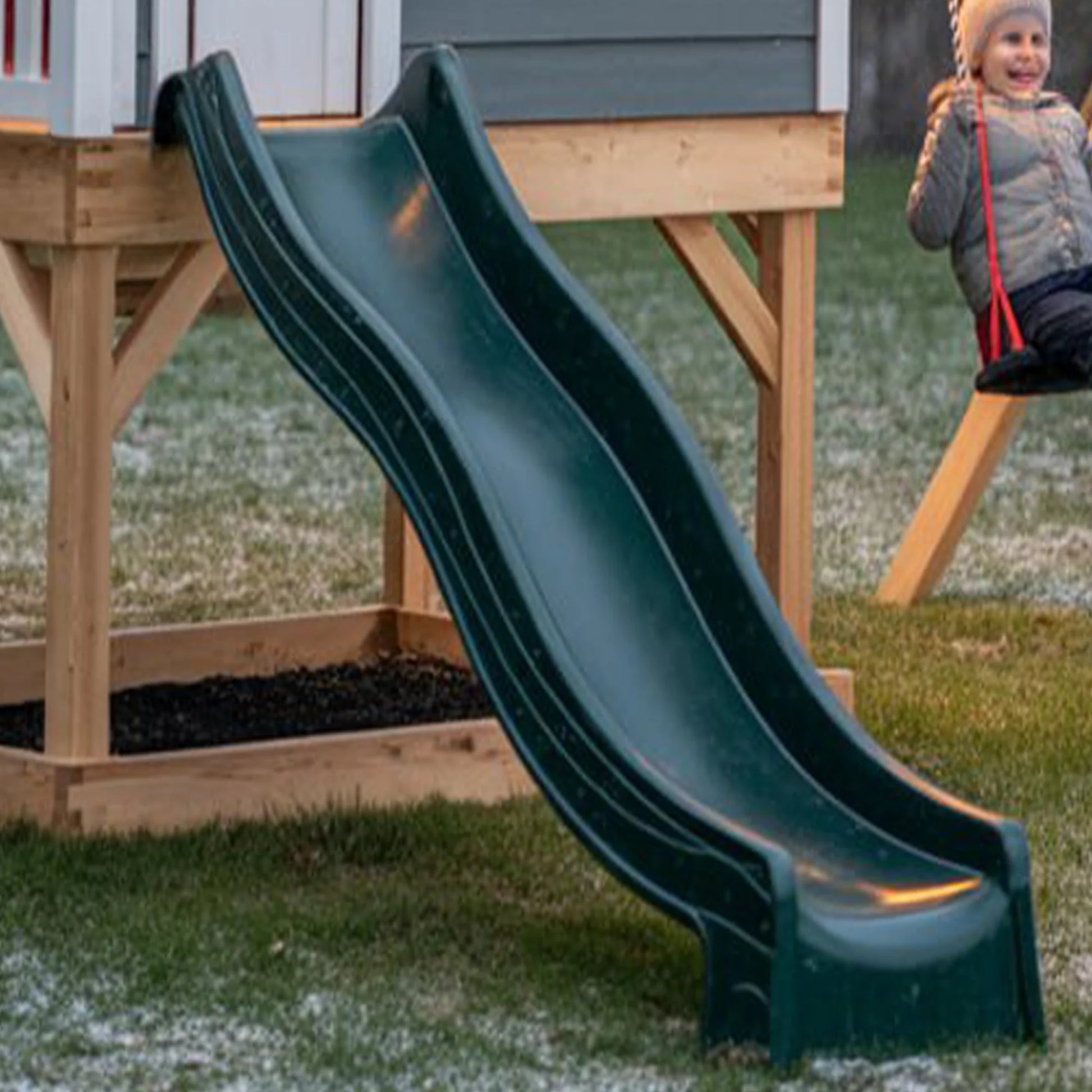 Our playsets are built from sustainably sourced cedar wood. We also make almost all our slides here in the US with 100% recyclable plastic. We gather all the plastic scraps and any defects from the slide formation process, and they are melted back into plastic sheets to be reused.