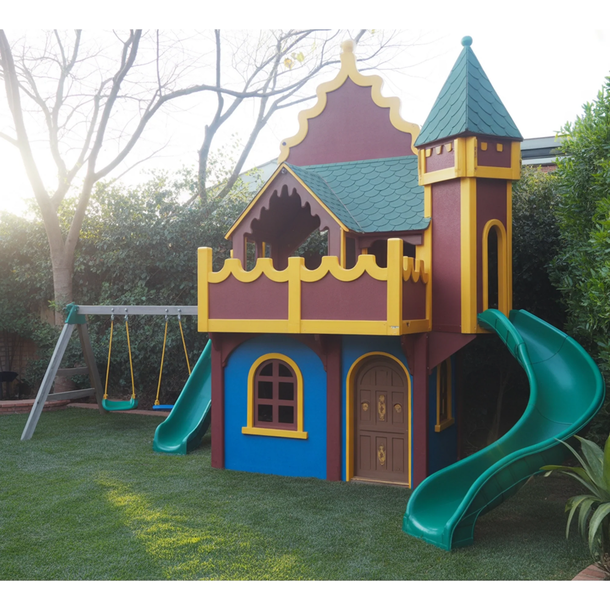 Exciting Play Options – Includes two slides, balcony, climbing access, and double swings.