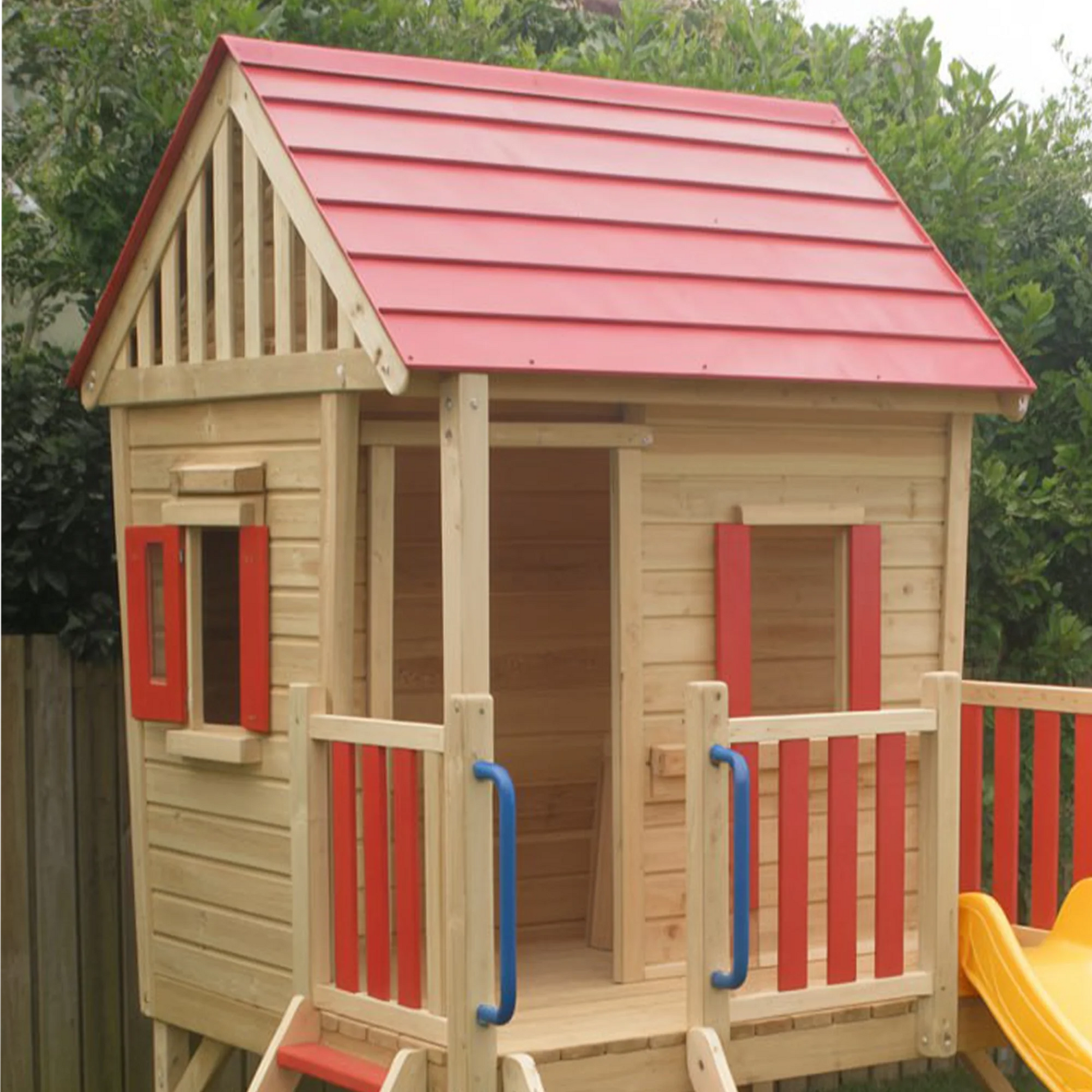 Playhouse Design – Includes windows, entryway, and elevated deck for a realistic house-like feel.