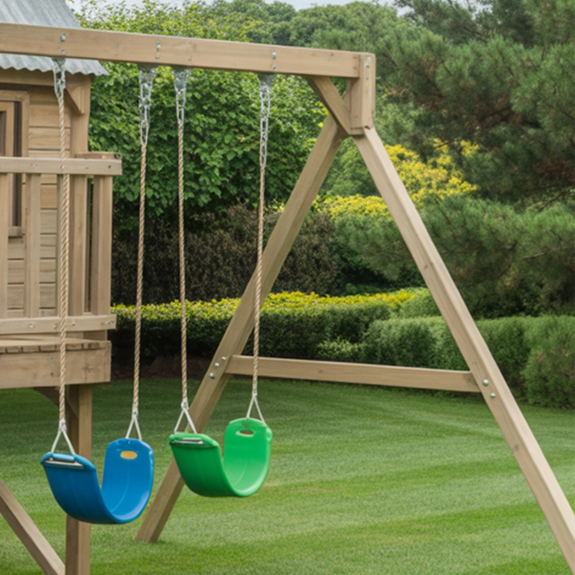 Swing Set: Includes double swings with bucket-style seats for both younger and older children.