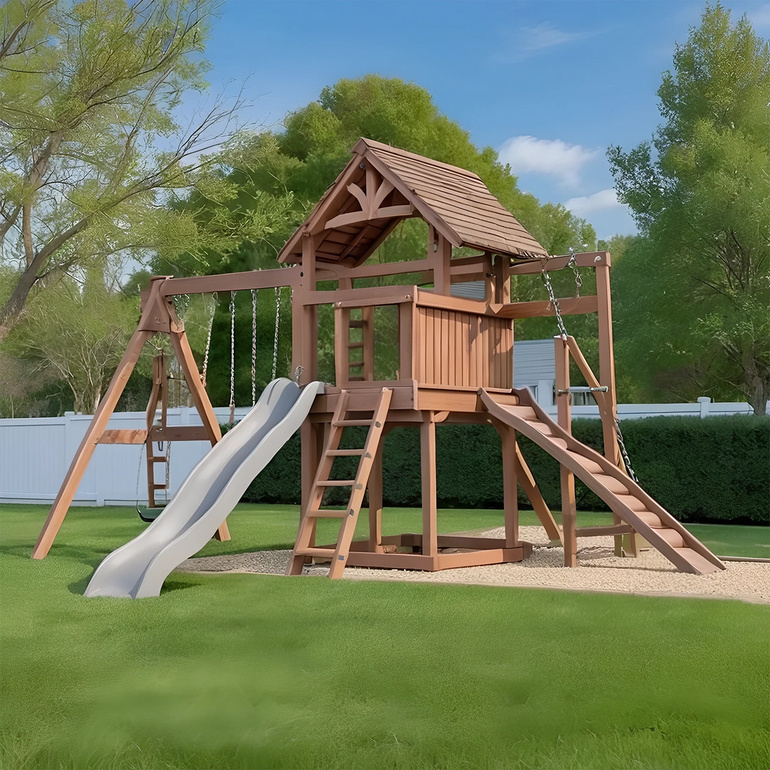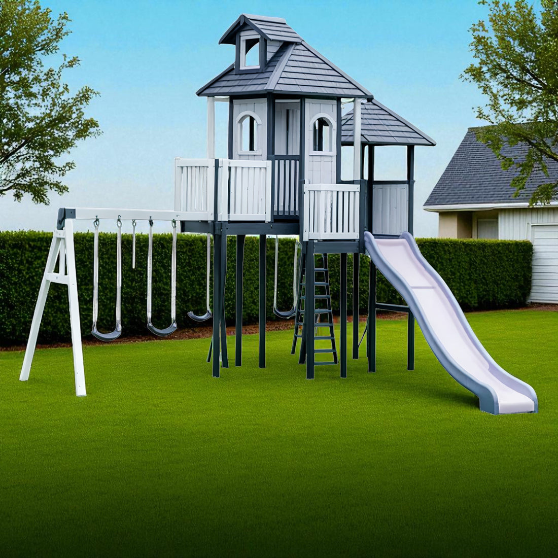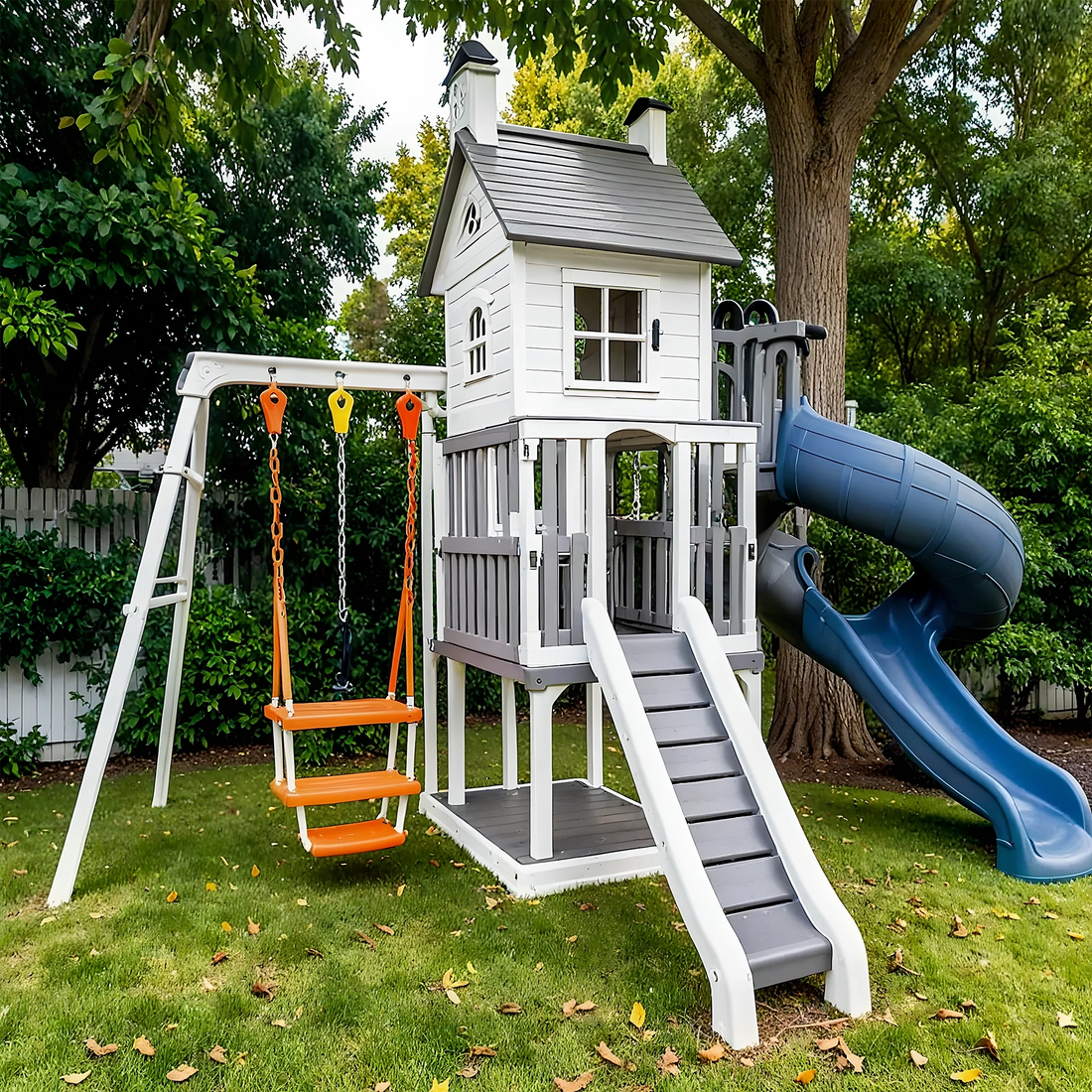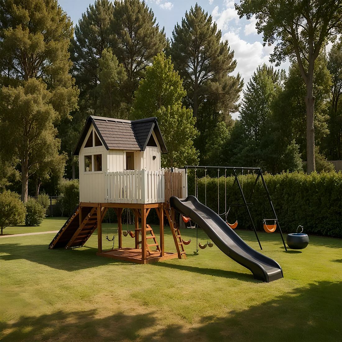 Bring imagination and adventure to your backyard with this beautifully crafted wooden playhouse and swing set. Designed with a charming cottage-style look, it features a raised platform with secure railings, a long slide, and a sturdy ladder for safe climbing. The attached swing frame adds extra fun, creating a complete outdoor activity center for kids.