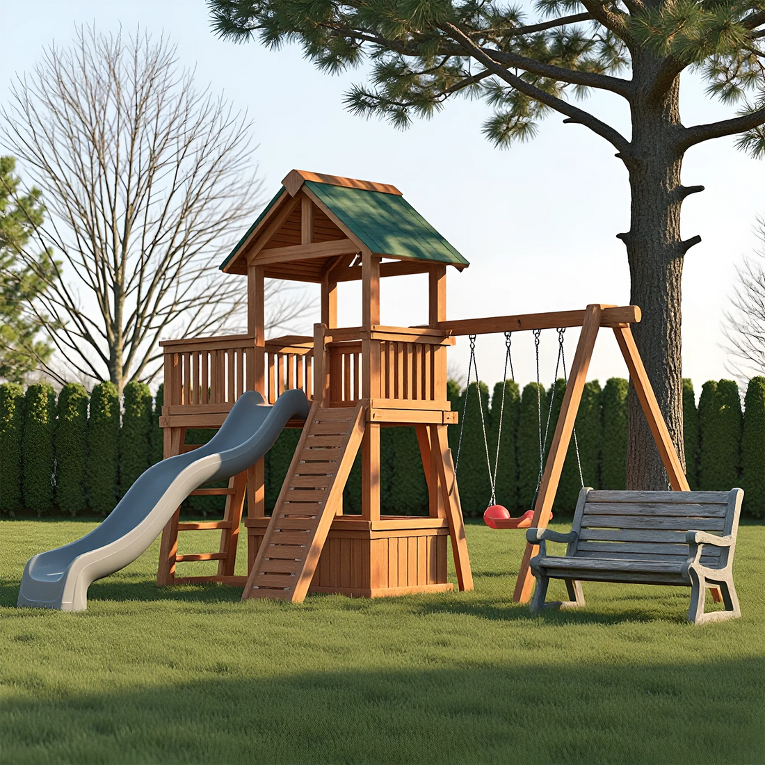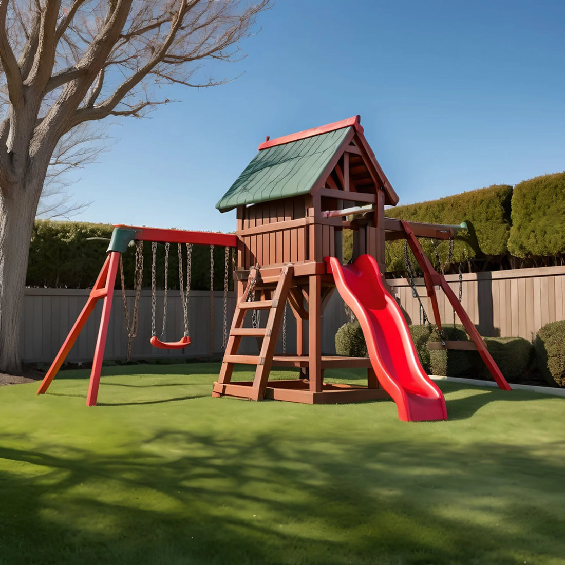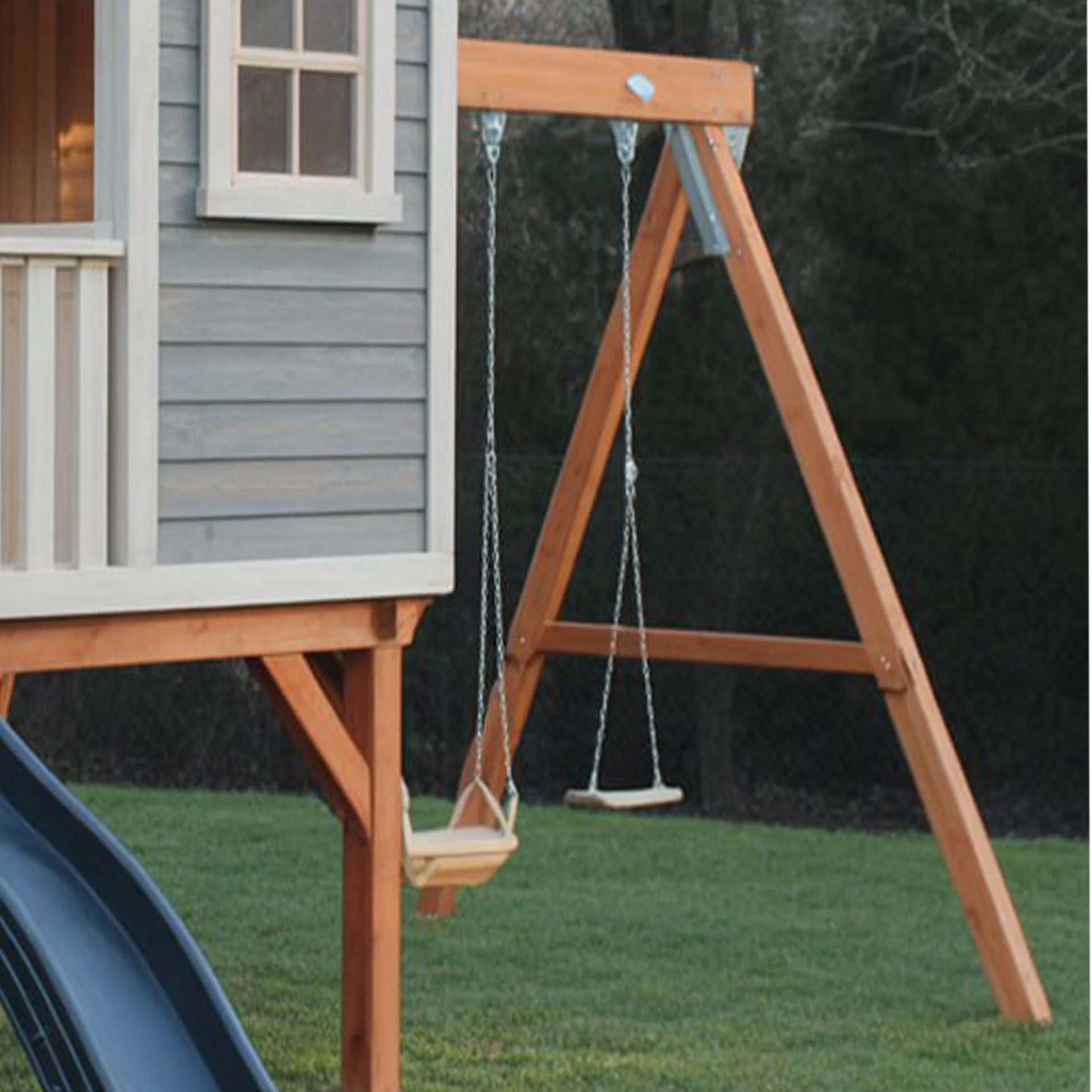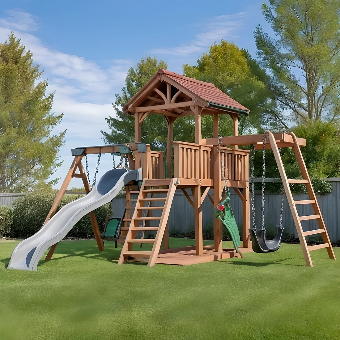 Bring imagination and adventure to your backyard with this beautifully crafted wooden playhouse and swing set. Designed with a charming cottage-style look, it features a raised platform with secure railings, a long slide, and a sturdy ladder for safe climbing. The attached swing frame adds extra fun, creating a complete outdoor activity center for kids.